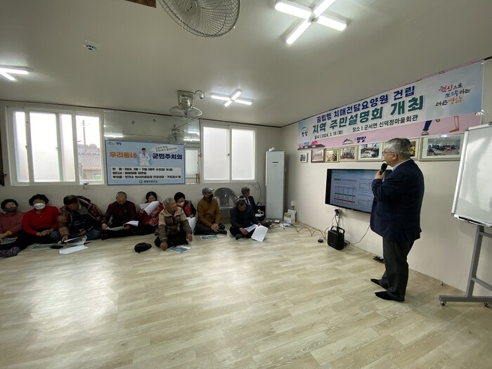 | ▲ 영암군, 지난 19일 군서면 신덕정마을회관에서 신덕정마을과 도리촌마을 주민 대상 ‘공립형 치매전담요양원 건립 주민설명회’ 개최 / 영암군 제공 |