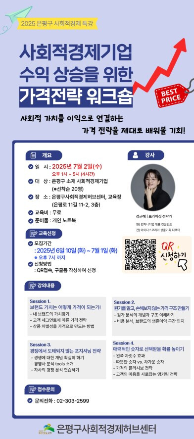 강의는 가격전략 전문 기업 주식회사 컴퍼니더업의 정근혜 대표가 맡는다. 정 대표는 여러 사회적경제기업, 청년 창업팀, 소상공인을 대상으로 다수의 가격전략 강의와 컨설팅을 진행해 온 전문가다.