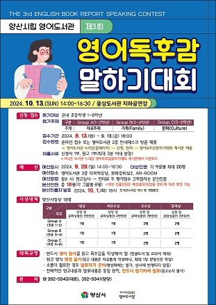 예선은 9월 29일 일요일 14시부터 영어도서관에서 실시하며, 각 부문별 본선 진출자 6명을 선정하여 10월 13일 14시부터 웅상도서관 지하공연장에서 본선 대회를 진행할 예정이다.