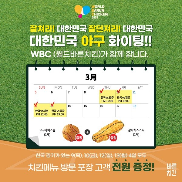 월드바른치킨 프로모션은 2023 WBC 경기 일정 동안 방문 포장 고객을 대상으로 진행되는 무료 증정 행사다. 한국 경기일인 3월 9일(목), 3월 10일(금), 3월 12일(일), 3월 13일(월)까지 총 4일간 진행되며, 치킨 주문 시 각각 ‘야구배트’와 ‘야구공’을 연상케 하는 ‘감자치즈스틱(1개)’과 ‘치즈볼(1개)’을 무료로 제공받을 수 있다.