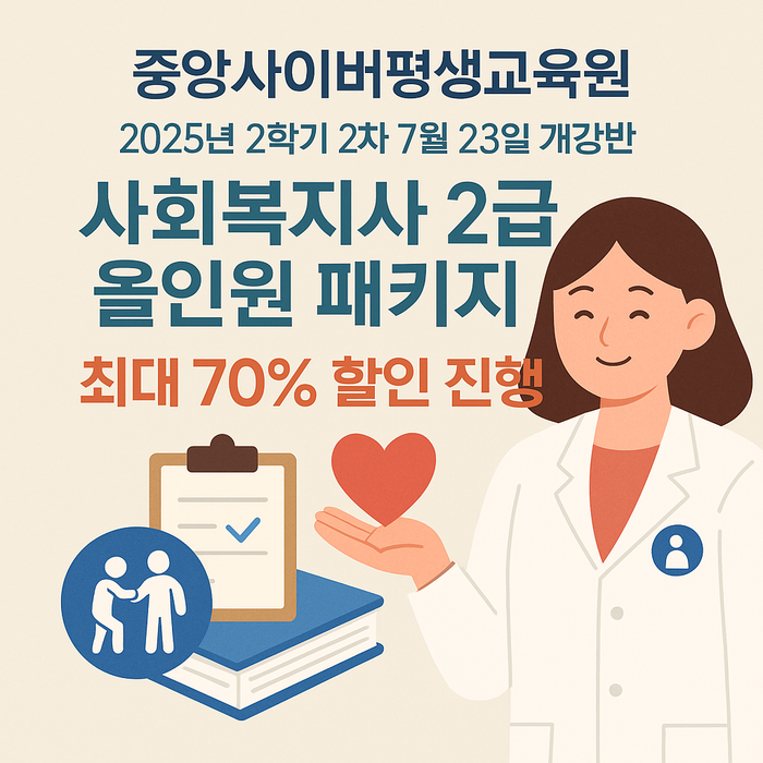 온라인 평생교육기관인 중앙사이버평생교육원에서 2025년 2학기 2차 과정으로 사회복지사 2급 이론 올인원 패키지 할인 이벤트를 진행한다고 밝혔다. 개강일은 7월 23일(수)이며, 수강신청은 개강 하루 전인 7월 22일(화)까지 가능하다.