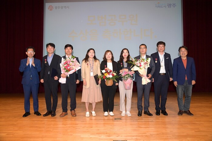 | ▲ 강기정 광주광역시장(오른 쪽 첫번째)이 4일 오전 시청 대회의실에서 열린 '7월 정례조회'에 참석해 모범공무원에 대해 표창을 수여한 후 기념촬영을 하고 있다./광주광역시 제공 |