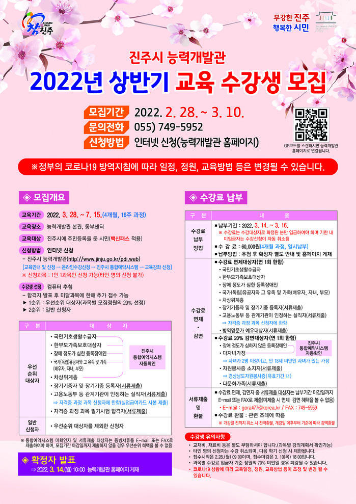 교육 신청은 진주시 능력개발관 홈페이지 에서 온라인으로 신청할 수 있으며 공정성을 기하기 위해 컴퓨터로 추첨해 수강생을 선정한다. 확정자 발표는 3월 14일 능력개발관 홈페이지 게재 및 SMS로 개별 통보한다.
