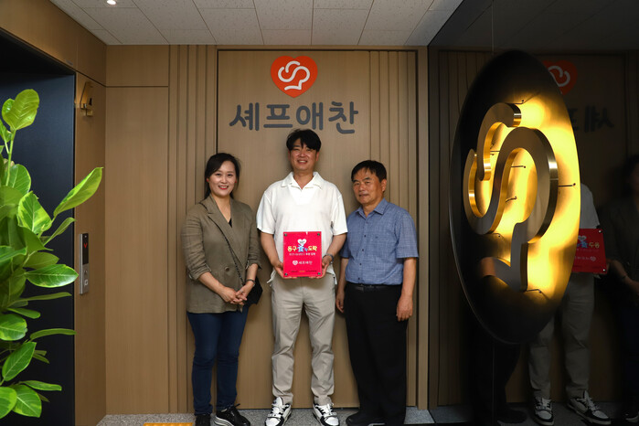 | ▲ 동구동락 센터장 이상순, 셰프애찬 박우연대표, 강홍순 이사 현판식 참여 (사진=셰프애찬 제공) |