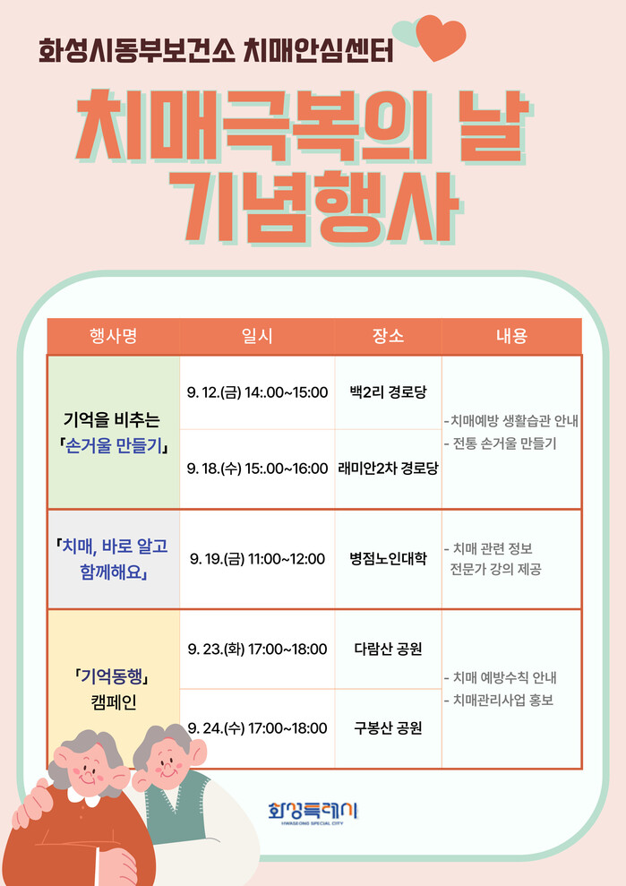 [화성=송윤근 기자] 경기 화성시동부보건소가 제18회 치매극복의 날을 맞아 12일부터 24일까지 치매 예방과 인식 개선을 위한 기념행사를 운영한다.