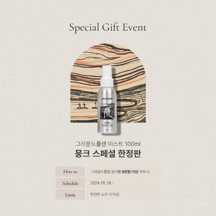 5월 28일부터 그라운드플랜 공식몰에서 8만 원 이상 구매 시 뭉크 한정판 미스트를 증정되며, 한정 수량으로 인해 선착순 마감되기 때문에 조기 종료가 예상된다. 동시에 인스타그램을 통한 제품 리뷰 이벤트도 함께 진행된다. 그라운드플랜의 제품에 대한 리뷰를 사진과 함께 남기고 필수 해시태그를 작성하면 참여가 완료되며, 해당 이벤트 또한 당첨 시 그라운드플랜의 뭉크 한정판 미스트가 증정된다.