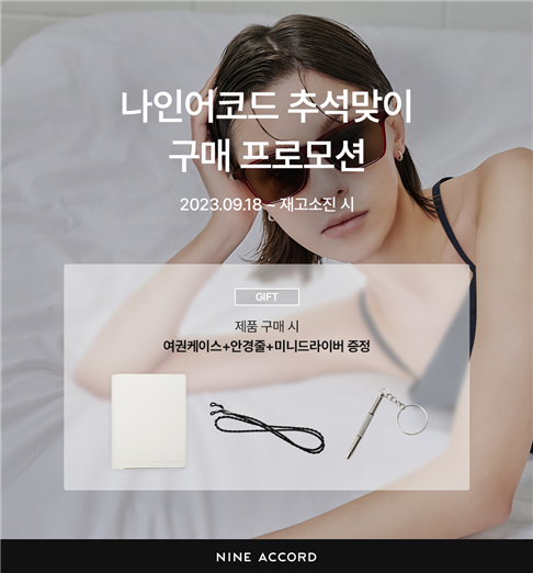 ㈜어반아이웨어 나인어코드 관계자는 “현대백화점 면세점 단독 나인어코드 추석맞이 구매 프로모션은 면세점을 방문해 주시는 많은 고객분들의 사랑에 보답하고자 하는 마음에서 대명절 추석을 맞이해 프로모션을 기획, 진행하게 되었다”고 밝혔다.