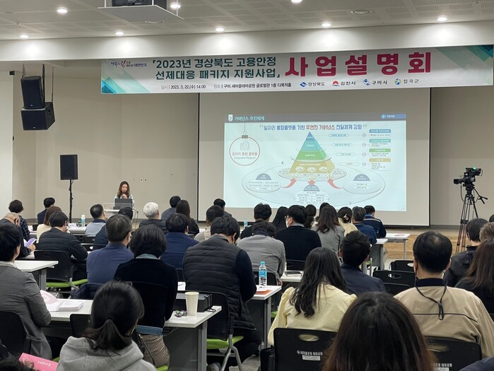[구미=박병상 기자] 경북 구미시(시장 김장호)는 지난 22일 새마을운동테마공원 글로벌관에서 지역 기업체와 기관 관계자, 시민 등 100여명이 참석한 가운데,‘2023년 고용안정 선제대응 패키지 지원사업 설명회’를 개최했다.