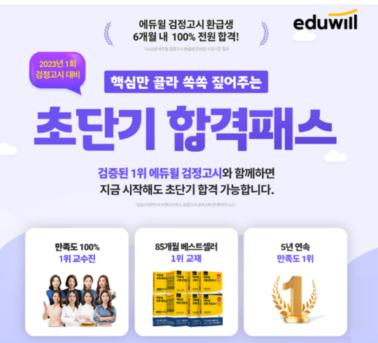 에듀윌 관계자는 “2023년 1회 검정고시 시험 합격을 위해 단기 학습에 최적화된 학습 콘텐츠를 전원 제공한다”며 “수많은 합격생이 선택한 에듀윌 검정고시 교수진의 강사력과 베스트셀러 교재, 다양한 학습 콘텐츠로 합격을 이루길 바란다”고 전했다.