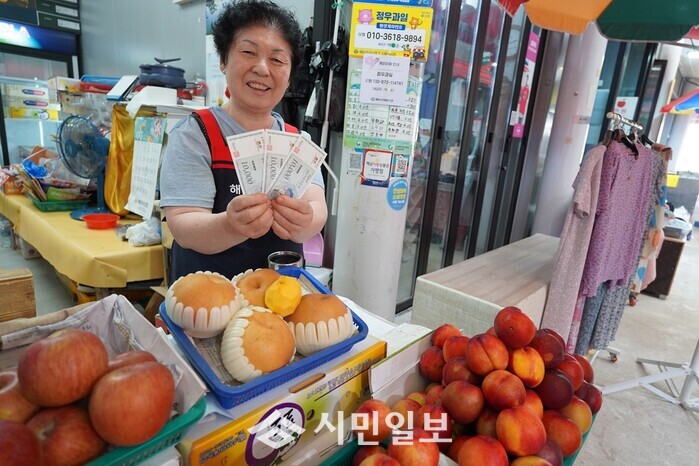 | ▲ 지류형 해남사랑상품권을 받은 과일가게 소상공인 / 해남군 제공 |