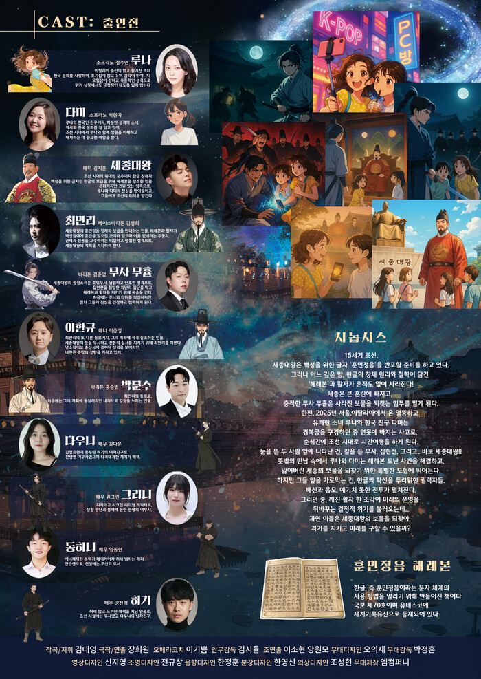 소프라노 정수연(루나), 소프라노 박현아(다미), 테너 김지훈(세종대왕), 바리톤 김준엽(무휼), 바리톤 김병희(최만리), 테너 김준성(이한규), 바리톤 홍승범(박문수) 등 국내 정상급 성악가들이 대거 출연한다.