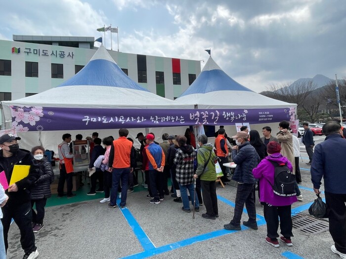 [구미=박병상 기자] 경북 구미도시공사는 지난 29일 올림픽기념국민생활관 주차장에서 시민들을 대상으로 한 ‘벚꽃길 행복나눔’ 행사를 뜻깊게 마쳤다고 밝혔다.