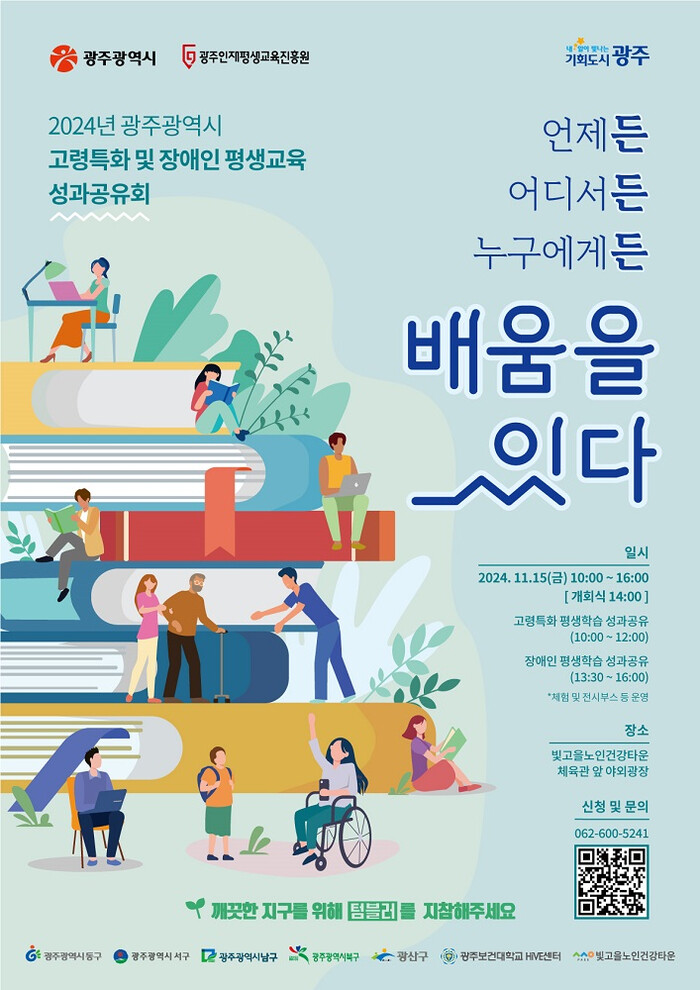 ‘언제든 어디서든 누구에게든 배움을 잇다’를 주제로 마련된 성과공유회는 한 해 동안 추진한 ‘고령특화 평생학습 지원사업’과 ‘광주 장애인 평생교육 사업’의 성과를 나누고, 기관과 학습자가 소통하는 자리로 꾸며진다. 특히 고령 학습자와 장애인 평생교육 참여자, 강사, 기관 관계자가 참여해 현장의 이야기를 생생하게 들려줄 계획이다.