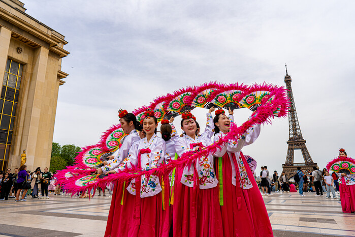 | ▲ 파리의 상징 에펠탑 앞에서 한국무용 공연 중인 아리랑 유랑단.(사진=아리랑 유랑단 제공) |