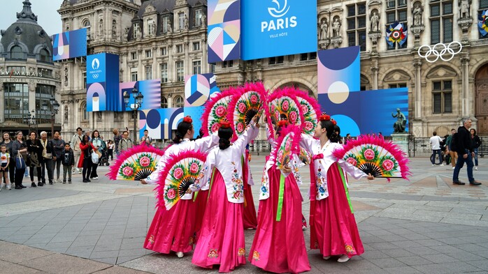 | ▲ 올림픽을 앞둔 파리 시청 광장에서 한국무용 공연 중인 아리랑 유랑단. (사진=아리랑 유랑단 제공) |