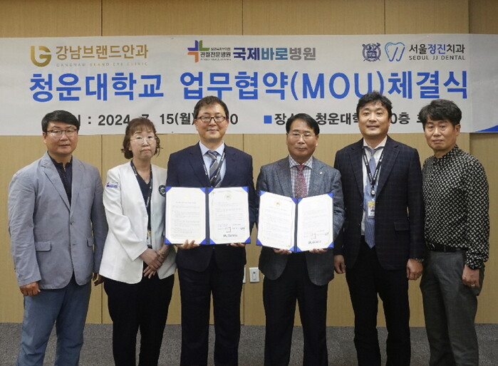 청운대 회실에서 진행된 협약식에는 국제바로병원 박기동 원무부장, 변진 간호부장, 김종환 행정부원장과 박건용 대학원장, 총원우회 전경천 회장, 수석부회장 홍대권 등이 참석했다.