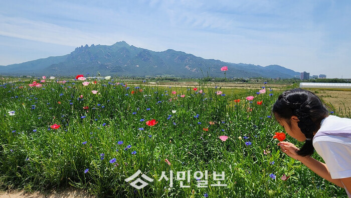 영암군이 지난해 10월 말 수레국화, 꽃양귀비, 안개초 씨앗을 파종한 구간에 꽃이 현재 형형색색 피어나 월출산, 영암천과 어우러지며 아름다움을 더하고 있다.