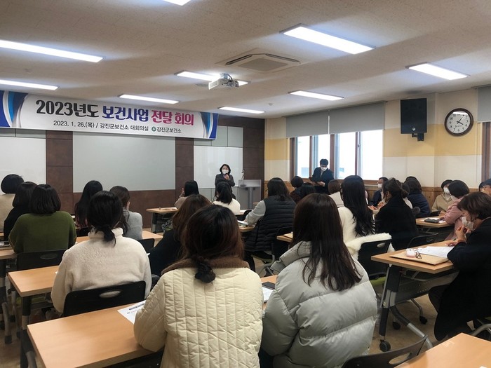| ▲ 강진군 보건소, 지난 26일 강진군보건소 대회의실에서 관내 보건기관 전담공무원 60여 명 대상 2023년 보건사업 전달회의 개최 / 강진군 제공 |
