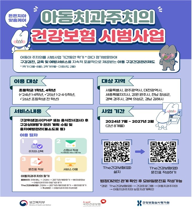 올해 시범사업 대상은 초등학교 1학년과 4학년 아동이다. 이들은 사업기간인 2년 8개월여 간 주치의로 등록한 치과의원을 학기별 1회(총 6회) 정기 방문해 구강검진을 받는다. 이를 통해 구강상태평가, 구강위생검사(PHP), 칫솔질교육, 불소도포 등 구강관리 교육 및 예방을 제공받는다.