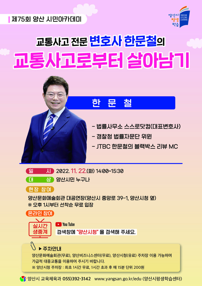 제75회 양산시민아카데미는 JTBC 한문철의 블랙박스 MC인 한문철 변호사를 초청해 ‘교통사고로부터 살아남기’란 주제로 진행되며, 무단횡단의 위험, 민식이법 위반사례 등을 통해 모두가 안전한 교통법규를 쉽게 배울 수 있는 의미 있는 자리가 될 것으로 기대된다.