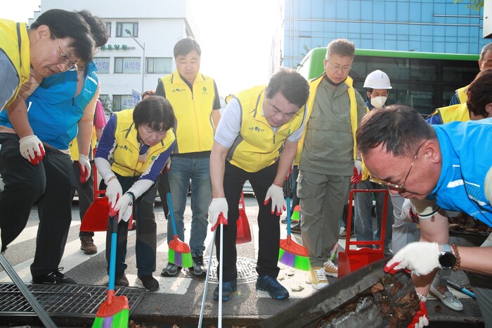| ▲ 박준희 구청장과 구 관계자, 주민들이 빗물받이를 들어내 청소하고 있다.(사진=관악구청 제공) |