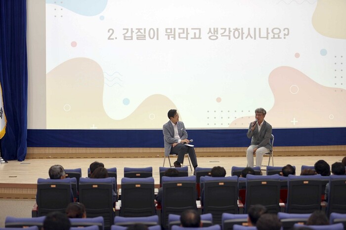 | ▲ 우승희 영암군수(왼 쪽)가 지난 7일 군청에서 청렴 의식 제고와 문화 확산을 위해 ‘군수와 함께하는 2023년 소통·공감 청렴 콘서트’에 참석해 한 공직자의 이야기를 경청하고 있다. / 영암군 제공 |