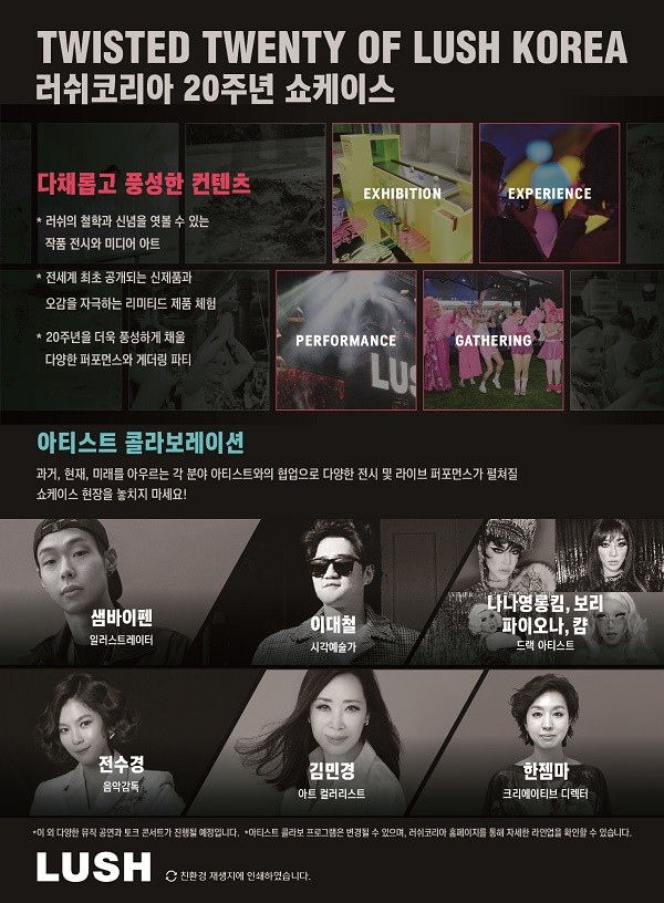'러쉬코리아 20주년 쇼케이스'는 러쉬코리아의 과거·현재·미래를 한 공간에 담아 브랜드 철학과 신념을 엿볼 수 있는 작품 전시부터 미디어아트를 비롯해 전 세계 최초로 공개되는 신제품까지 다양한 볼거리와 즐길거리로 구성됐다.