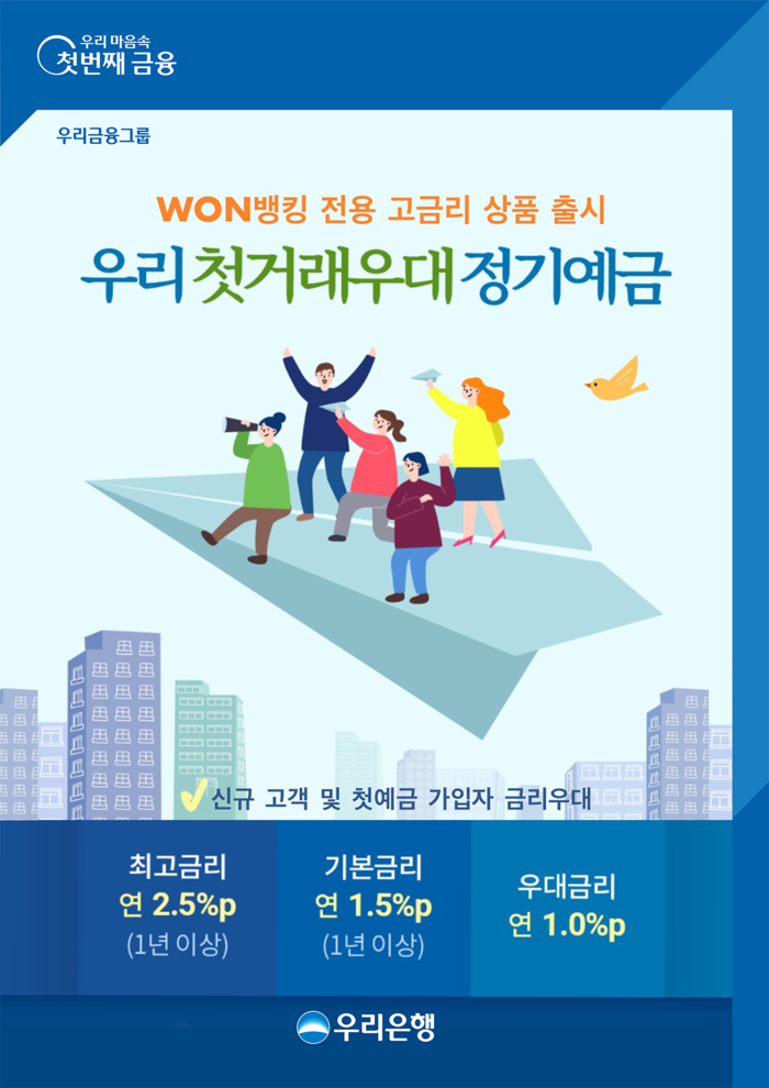 [시민일보 = 홍덕표 기자] 우리금융지주 자회사 우리은행은 4월1일 최고 2.5%의 금리를 제공하는 ‘우리 첫거래우대 정기예금’을 출시한다고 31일 밝혔다.