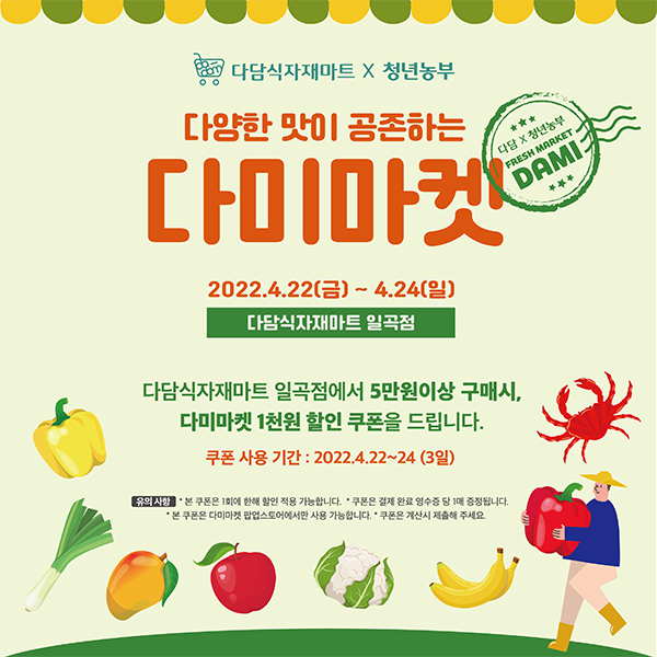 또한 행사기간 동안 쿠폰 이벤트도 진행된다. ‘다미마켓’ 진행 기간 동안 다담식자재마트 일곡점에서 5만 원 이상 구입하는 고객에게는, ‘다미마켓’에서 사용할 수 있는 1천 원 쿠폰이 제공된다. 해당 쿠폰은 ‘다미마켓’에서 구매 건 당 1장씩 사용 가능하며 금액 제한은 없다.