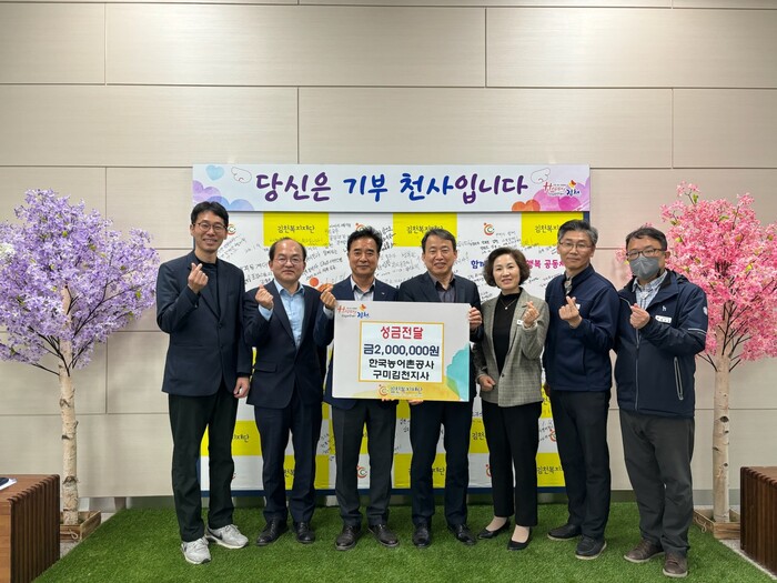 한국농어촌공사 구미김천지사는 농업 생산 기반 조성 사업을 비롯해 농촌 지역개발, 농업 소득 증대 등을 위해 노력하고 있으며, 취약계층의 복지 증진을 위해 농촌 집 고쳐주기, 이웃돕기 성금 전달 등 지속해 나눔 활동을 실천하고 있어 지역사회 상생협력의 모범이 되고 있다.