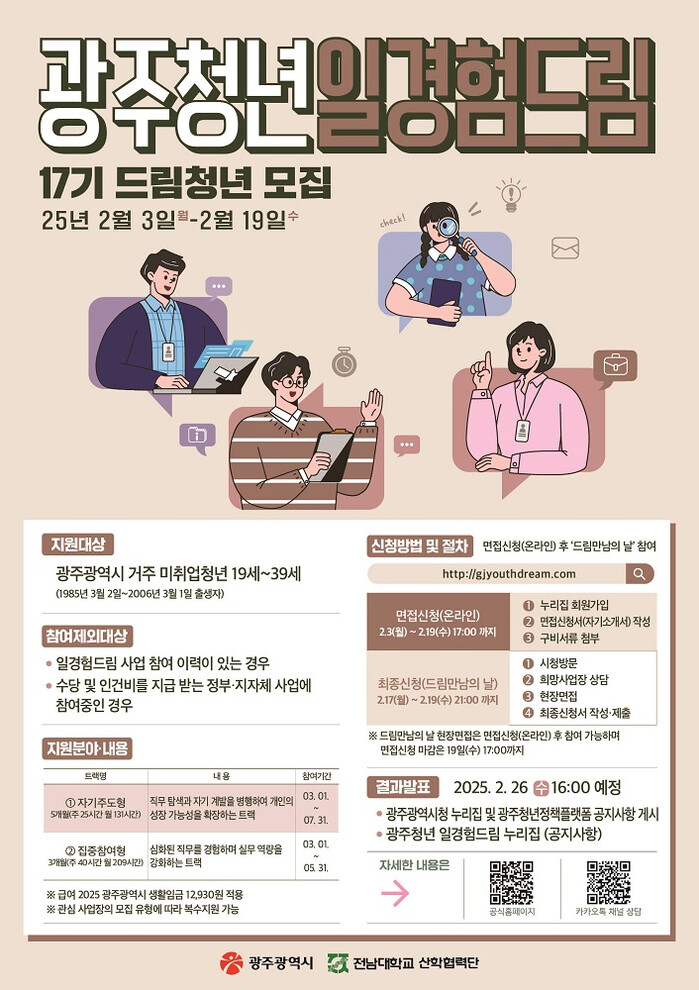 문의는 카카오톡채널 ‘광주청년드림’과 광주청년 일경험드림 사업단으로 하면 된다.