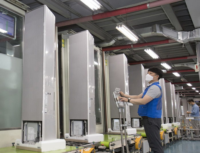 | ▲ 광주광역시 광산구 하남산단 6번로에 위치한 삼성전자 광주사업장에서 직원들이 '비스포크 무풍에어컨 갤러리'를 생산하는 모습.(사진제공=삼성전자) |