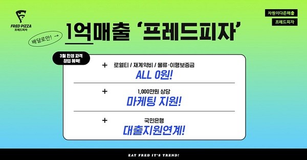 프레드피자는 이번 창업 혜택에서 ▲로열티·재계약비·물류보증금·이행보증금 비용 면제 ▲인플루언서 등을 통한 인스타그램&블로그 온라인 홍보비 지원 ▲배달앱 할인 프로모션 지원 ▲국민은행 대출지원 연계 등을 지원하다.