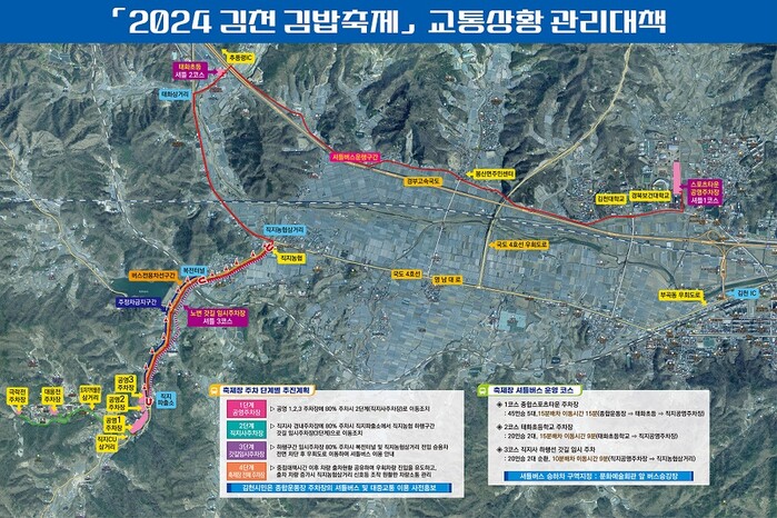 [김천=박병상 기자] 김천시(시장 김충섭)는 10월 26과 27일 개최되는 2024 김천 김밥축제의 성공적인 개최를 위해 축제기간 동안 차량통제를 실시한다고 밝혔다.