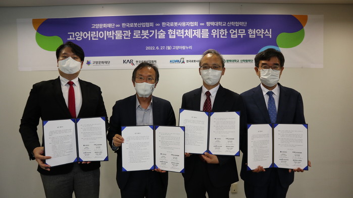 고양문화재단은 27일 고양아람누리에서 정재왈 고양문화재단 대표이사와 한국로봇산업협회 조영훈 전무, 한국로봇사용자협회 이천 센터장, 평택대학교 산학협력단 이태규 단장 등 4개 기관 관계자가 모인 가운데 업무 협약을 진행했다.