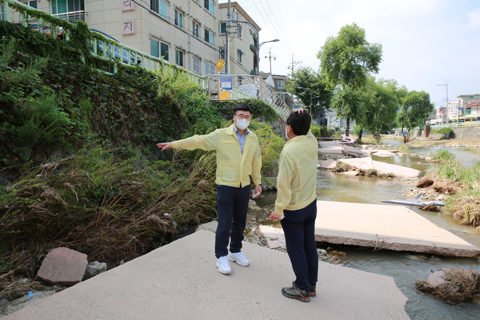 경기 수원시 장안구가 지난 2일, 건설과를 비롯한 각 부서 및 동에서 제11호 태풍 ‘힌남노’대비를 위한 집중호우 피해지역과 위험 지역 현장을 점검했다. 사진은 현장을 찾은 최상규 구청장(왼쪽)이 관계자와 이야기를 나누고 있는 모습.(사진제공=장안구청)