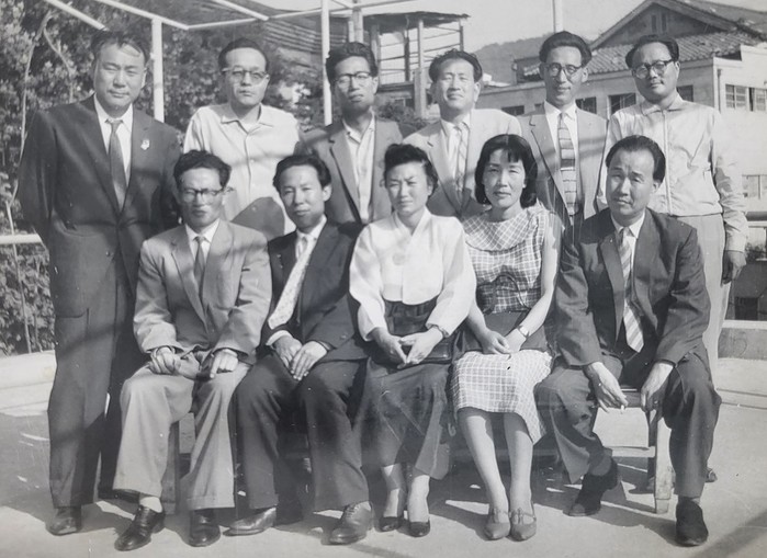 | ▲ 백양회 회원 1950년대 후반 천경자(앞줄 오른쪽에서 두번째), 박래현(앞줄 중앙), 김기창(뒷줄 맨 좌측), 이유태(뒷줄 우측에서 두번째),김정현(뒷줄 맨 우측) |