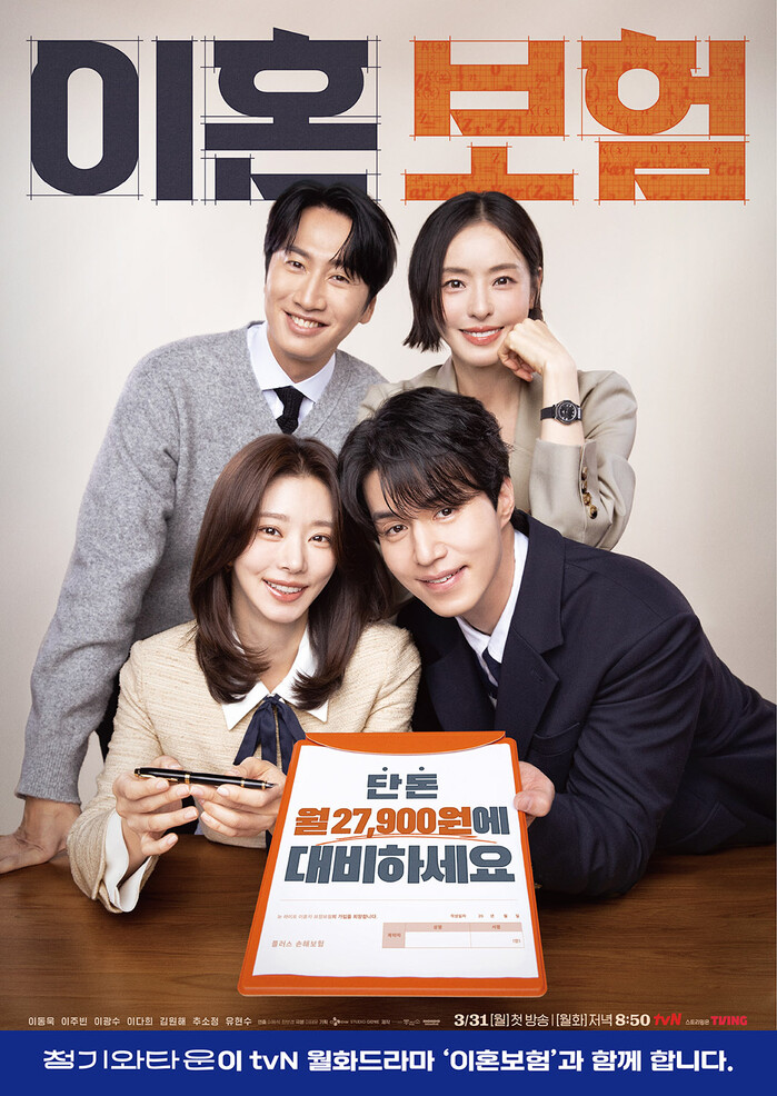tvN 드라마 ‘이혼보험’(이동욱, 이주빈, 이광수, 이다희 주연)은 순수 보장형 오피스 로맨틱 코미디다. 최고의 브레인만 모여 있는 플러스 손해보험 혁신상품개발팀에서 이혼보험 상품을 선보이며 벌어지는 이야기를 그린다.