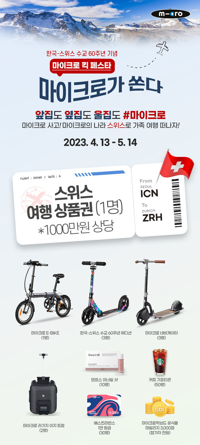 해당 이벤트는 추첨을 통해 선정하며 1등에게는 1,000만원 상당의 스위스 가족 여행권을 비롯하여 2023년 새롭게 출시한 전기자전거인 마이크로 E-BIKE(이바이크), 한국·스위스 수교 60주년을 기념해 제작한 한정판 스쿠터, 마이크로 네비게이터, 배스킨라빈스, 스타벅스 커피 기프티콘 등 다양한 경품이 준비되어 있다. 또한 행사 참가자 전원에게는 마이크로 킥보드 공식몰 마일리지 3,000원을 지급한다.