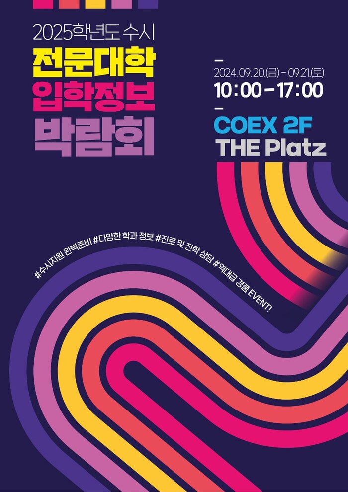 해당 박람회에는 서울지역 모든 대학을 비롯해 경기인천지역 뿐 만 아니라 강원, 대전·충청·세종, 경북 지역 등 전국 50여 개의 전문대학이 참가한다고 밝혔다. 올해 가장 큰 규모의 전문대학 박람회이자 코엑스에서 개최되는 유일한 행사라는 게 관계자의 설명이다. 수험생들은 관심대학의 입시 담당자와 1:1 맞춤형 상담을 진행하는 등 2025학년도 수시 모집과 관련된 다양한 정보를 제공받을 수 있다.