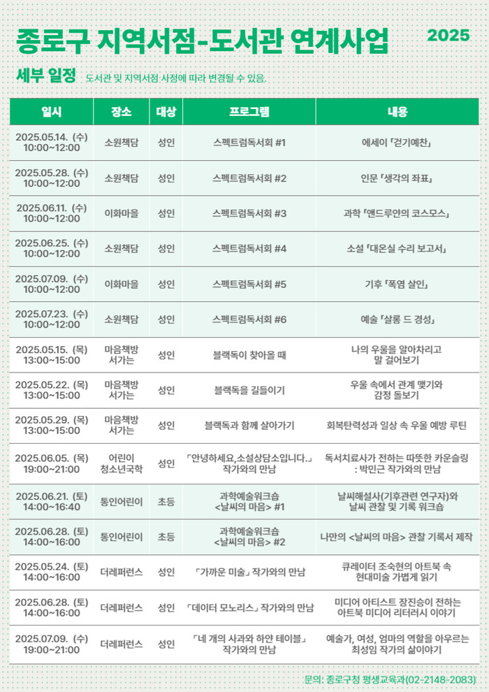 프로그램별 운영 일시는 종로구립도서관 누리집에서 확인하거나 평생교육과로 전화 문의하면 된다.