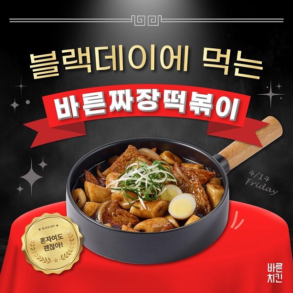 올해도 외로운 솔로들을 위해 바른치킨도 발벗고 나섰다. 바른치킨이 블랙데이를 기념해 최근 출시한 바른짜장떡볶이를 시식할 수 있는 SNS 이벤트를 마련했다. 오는 14일(금)부터 16일(일)까지 3일간 인스타그램을 통해 진행되며 솔로인 친구를 태그해 응원 댓글을 남기는 이벤트다.