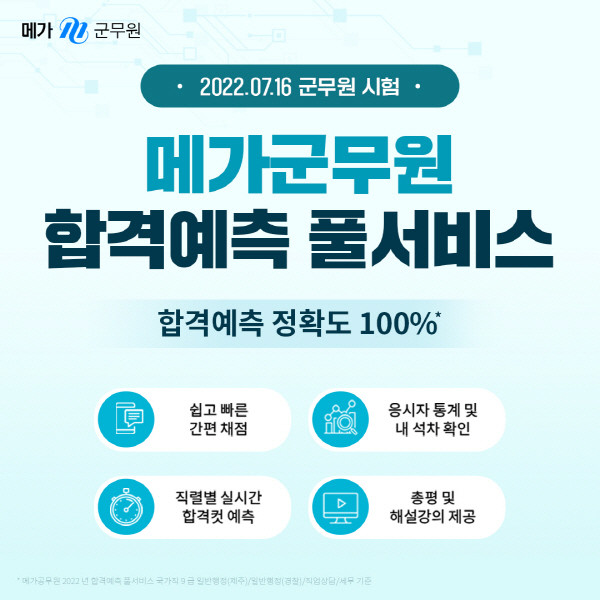 한편, 메가군무원 합격예측 풀서비스는 국방부, 육군, 해군, 해병대, 공군 필기시험을 치른 군무원 수험생이라면 누구나 참여할 수 있으며, 보다 자세한 사항은 공식 홈페이지를 통해 확인할 수 있다.