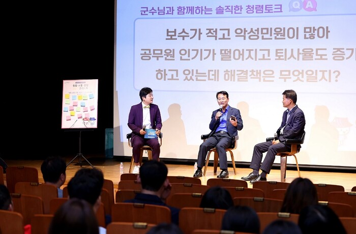 이날 청렴에 대해 쉽게 이해하고 친숙해질 수 있도록 강진원 군수가 대담자로 참석한 청렴 토크와 채용청탁, 갑질, 청탁금지법, 이해충돌방지법 등 청렴 제도들의 목적과 의미를 선보이는 청렴 뮤지컬 ‘부패탈출 넘버원 갱생 트레이닝 센터’가 진행됐다.