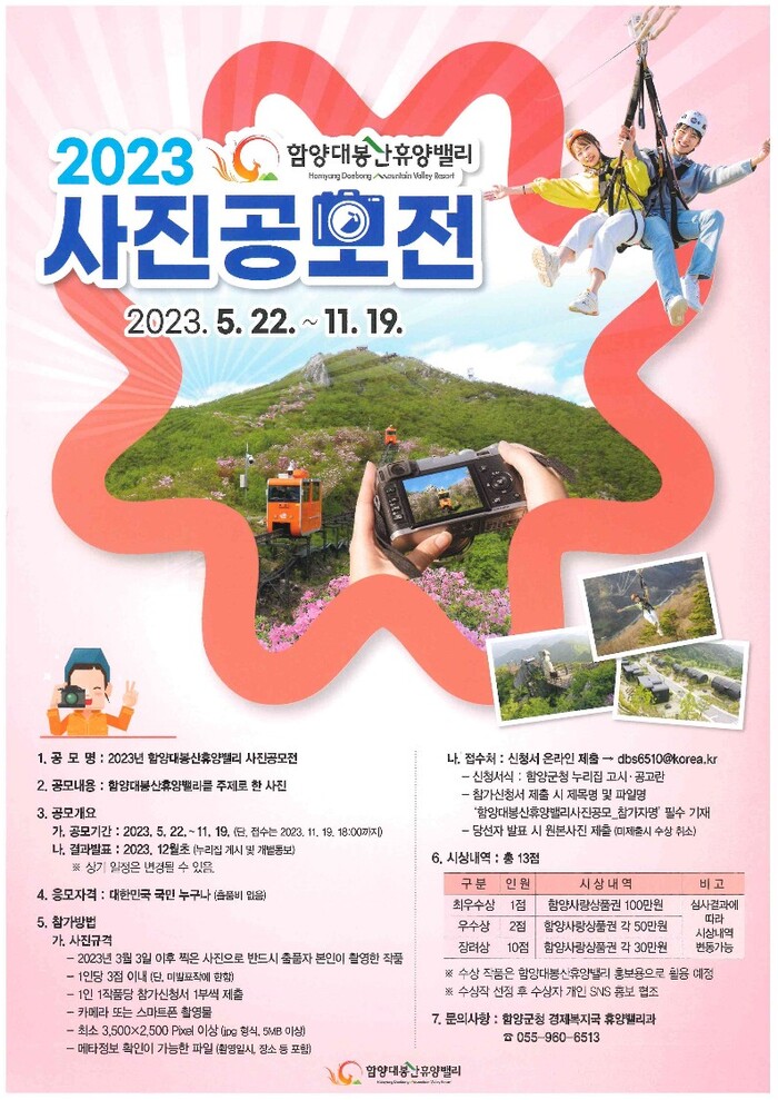 군은 오는 12월 초 전문가 심사를 거쳐 13점을 선정하여 총 500만원의 함양사랑상품권과 상장을 수여할 예정이며, 수상작은 대봉산휴양밸리 홍보용 등으로 활용할 계획이다.