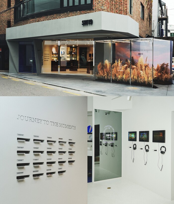 SW19은 브랜드 슬로건 ‘JOURNEY TO THE MOMENTS, 행복한 시간들로의 여행'을 공간에 담기 위해 인테리어 디자인에도 힘썼다. 소중한 추억들을 담은 타임캡슐에서 영감받아 클래식한 소재를 모던하게 재해석한 오브제들을 활용하여 SW19 플래그십 스토어를 방문하는 고객들이 이 공간에서 나만의 행복한 기억을 떠올릴 수 있도록 했다. 그리고 보이지 않는 향을 온전히 느낄 수 있도록 후각뿐 아니라 시각, 청각 등 다양한 감각들을 자극하여 향을 입체적으로 경험할 수 있는 데에 중점을 뒀다.