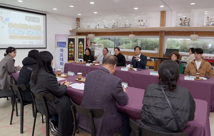 [영암=정찬남 기자] 우승희 영암군수가 지난 14일 군서면 희갤러리에서 마을학교대표 11명과 ‘제32차 목요대화’를 열고, ‘2023년 마을학교’ 운영 성과를 공유하는 등 다양한 의견을 주고받았다.