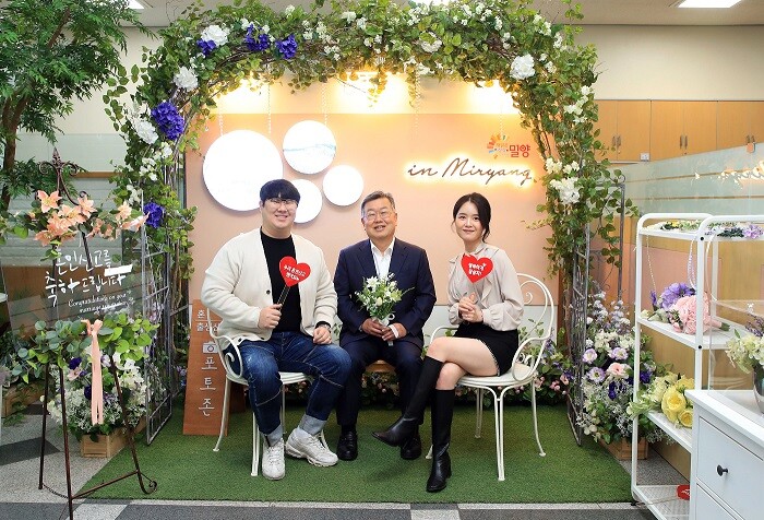 [밀양=최성일 기자] 밀양시(시장 박일호)는 시청 민원실 내 시민들의 힐링 고품격 공간으로 새롭게 재탄생한 혼인신고 포토존에서 ‘시장님과 함께하는 기념 촬영 이벤트’를 진행해 뜻깊은 추억을 남겼다고 5일 밝혔다.