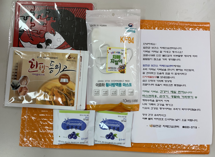 24일 1차 배송을 시작으로 재가 치매어르신 1,567명에게 안부편지 및 생활방역을 위한 KF94마스크, 한방파스, 화투퍼즐, 하루견과 등으로 구성된 우편물 키트를 비대면으로 전달할 예정이다.