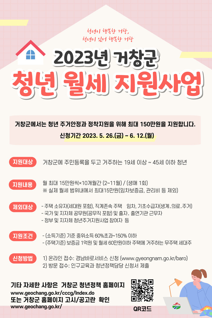 지원대상은 공고일 기준 거창군에 주민등록이 되어 있는 만 19~45세 이하 청년이 세대주인 가구로, 소득 기준은 중위소득 60% 초과 150% 이하이며, 주택 기준은 임차보증금 1억 원 이하이면서 월 임차료 60만 원 이하여야 한다.